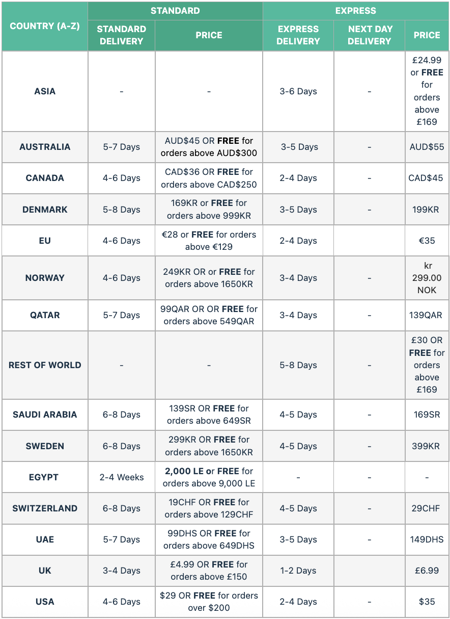 يرجى الاطلاع أدناه لمعرفة أسعار الشحن الدولية لدينا وأوقات التسليم